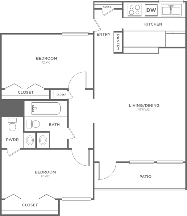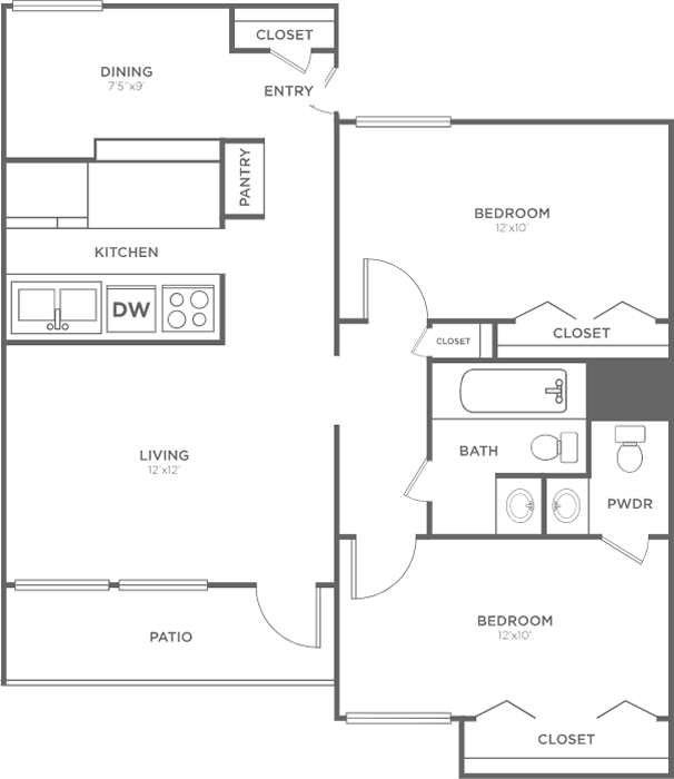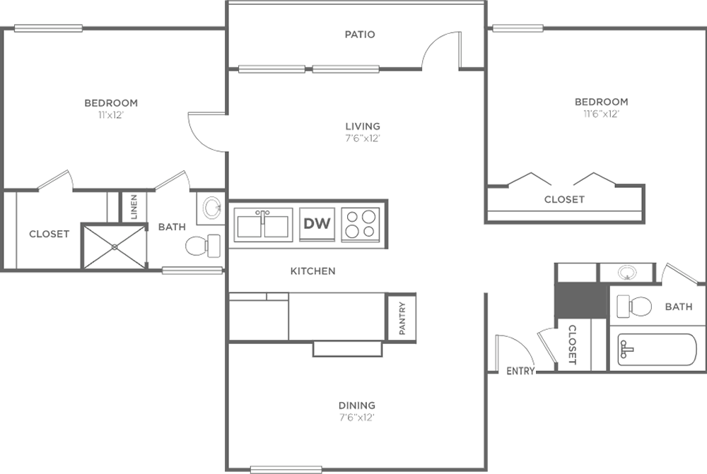 A two bedroom layout with separated bedrooms, useful storage, and comfortable shared living space.