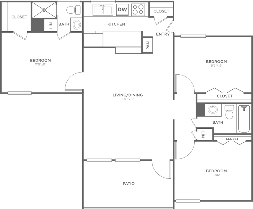 A larger apartment layout with extra room for shared living, storage, or a flexible work-from-home setup.